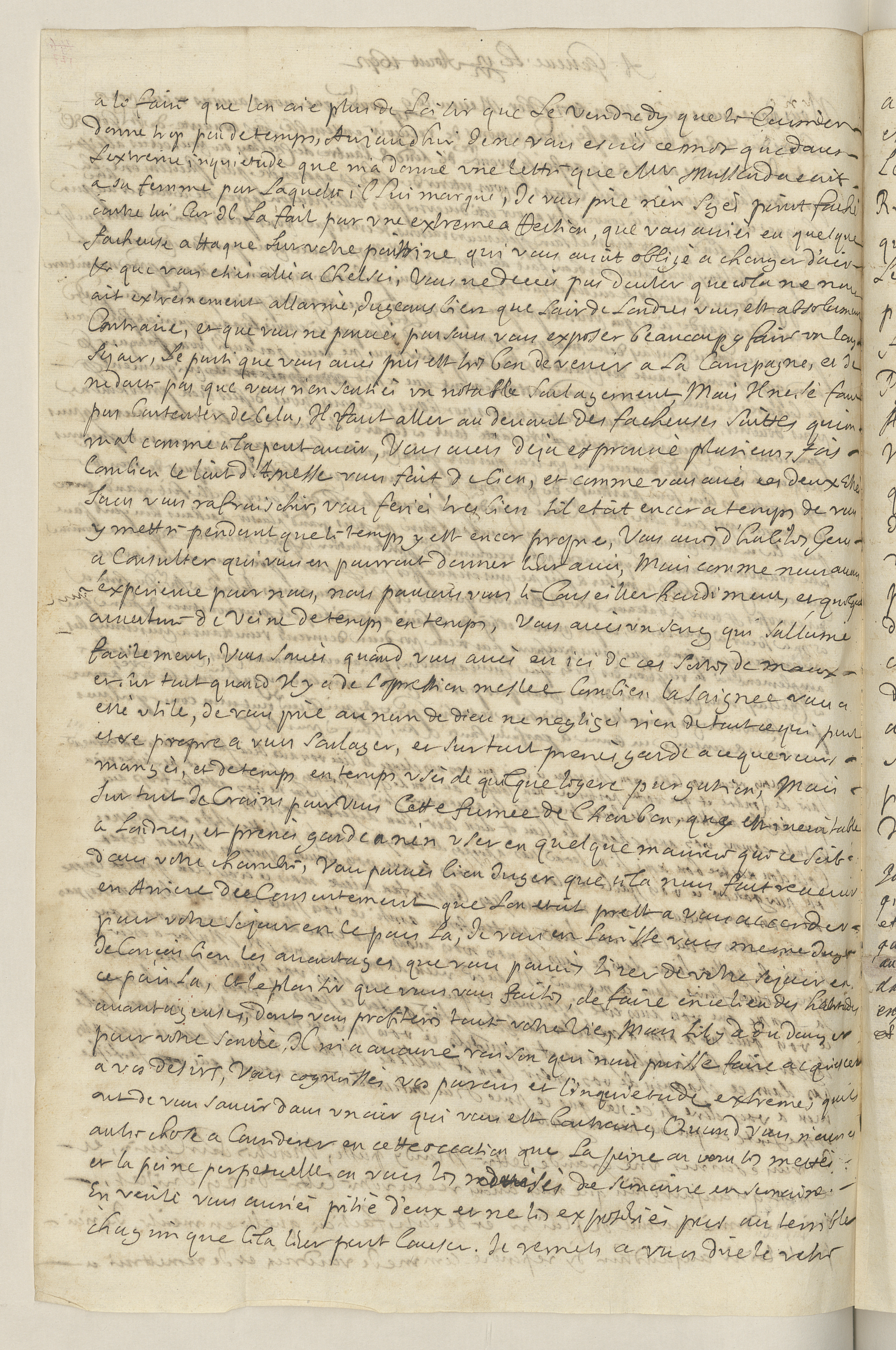 Par une lettre de [Bénigne] Mussard, on a appris que JA était incommodé et on s'inquiète beaucoup de ses maux de poitrine. L'air londonien ne lui convient sûrement pas et il ne doit pas songer à prolonger son séjour dans cette ville. Son sang s'échauffe facilement et sa poitrine est sujette à oppression. L'expérience lui a montré les remèdes qui le soulagent, entre autres le lait d'ânesse et la saignée. Il ne doit pas rechigner à les utiliser. Micheli redoute particulièrement pour JA la fumée de...