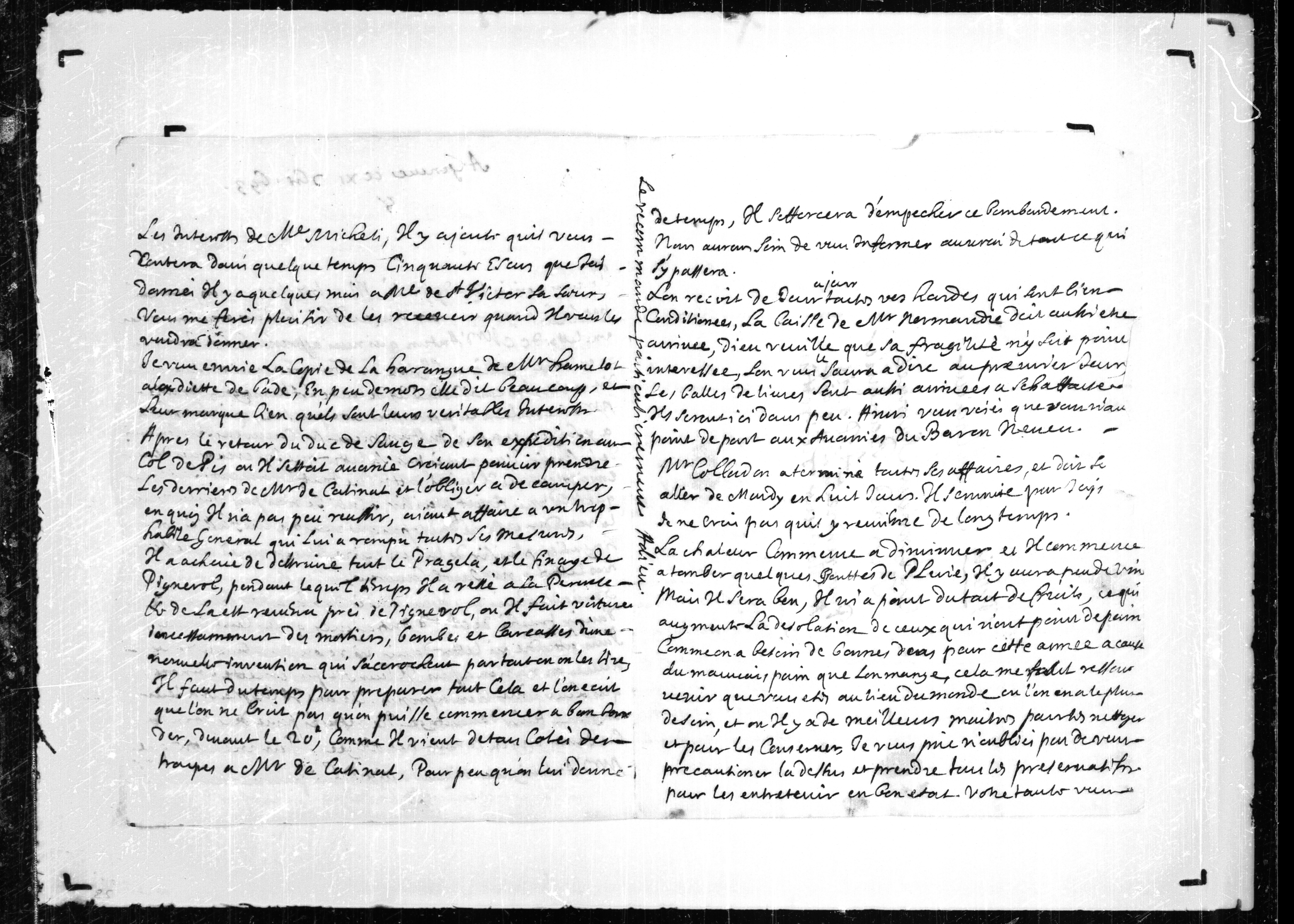 Ils ont reçu une lettre de [Jean-Antoine] Dautun qui leur a appris la bonne nouvelle de sa vocation par l'Église de Francfort, incontestablement une des plus considérables de toute l'Allemagne. Il joint la lettre de Dautun qui attribue à l'oncle de JA [Bénédict II Turrettini] tout le mérite grâce à ses recommandations; en effet celui-ci s'était tout de suite adressé à son bon ami [Jacob] Couvreu. Bénédict Turrettini a fait remettre aux sœurs de [Frédéric] d'Entragues les 400 livres qu'il avait remises à JA pour elles. L'argent est arrivé bien à propos et JA est prié de ne pas refuser les sommes que cet homme pourrait lui remettre encore en leur faveur. D'Entragues vient d'ailleurs d'avertir Micheli qu'il confiera de nouveau 50 écus à JA, et Micheli les a déjà versés à Madame de Saint-Victor [une des sœurs]. Micheli envoie à JA la copie de la harangue d'Amelot à la Diète de Baden: elle dit beaucoup en peu de mots. Le duc de Savoie [Victor-Amédée II] est revenu de son expédition au col de Pis d'où il pensait pouvoir tomber sur les arrières de Catinat et l'obliger à décamper. Il n'a pas réussi car ce dernier est trop habile général. Le duc a alors achevé de détruire le Pragelas. On attend de partout des troupes pour Catinat qui pourront peut-être empêcher le bombardement prévu de Pignerol. On reçoit, jour après jour, les hardes de JA, qui sont bien conditionnées; les balles des livres sont arrivées à Schaffhouse et seront bientôt à Genève. [Germain] Colladon a terminé ses affaires et partira dans peu de jours. La chaleur commence à diminuer et tombent quelques gouttes de pluies; il y aura peu de vin mais il sera bon. Il n'y a pas du tout de fruits, ce qui augmente la désolation de ceux qui n'ont pas de pain. Celui-ci est si mauvais cette année qu'il nécessitera de bonnes dents. JA est au lieu du monde où existe ce qu'il y a de meilleur pour les nettoyer et les entretenir, on le prie de prendre tout ce qu'il faut pour les conserver en bon état.