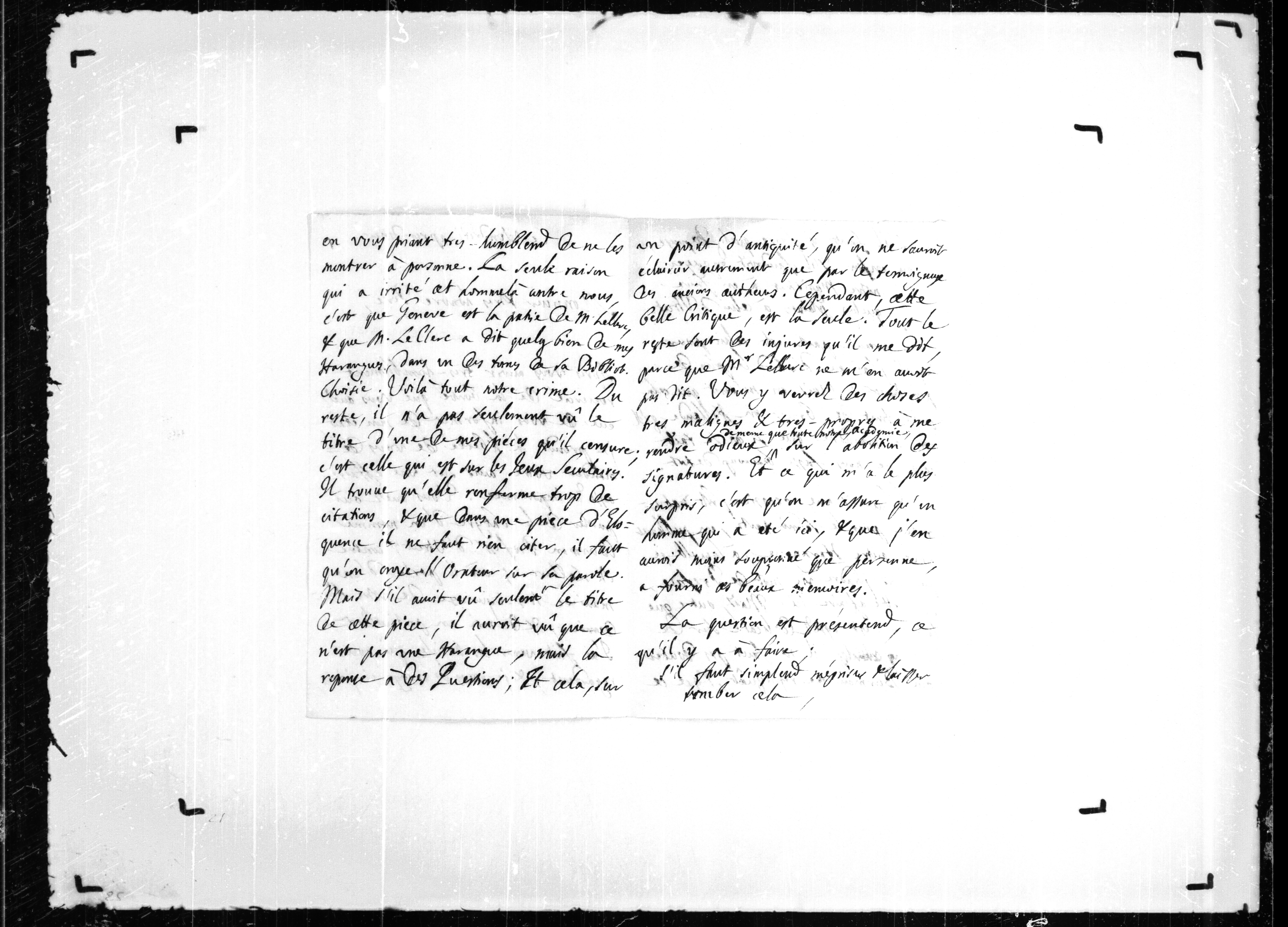 JA rend compte à Sartoris d'une affaire assez importante. [Pieter] Burman, professeur d'Utrecht, a publié une satire [Le gazetier menteur] contre [Jean] Le Clerc dans laquelle il parle de façon très injurieuse de l'Académie de Genève et de JA en particulier. Celui-ci a fait venir les articles en question et les envoie à Sartoris avec prière de ne les montrer à personne. La seule raison qui a irrité cet homme contre Genève est que cette ville est la patrie de Le Clerc et que Le Clerc a lou...
