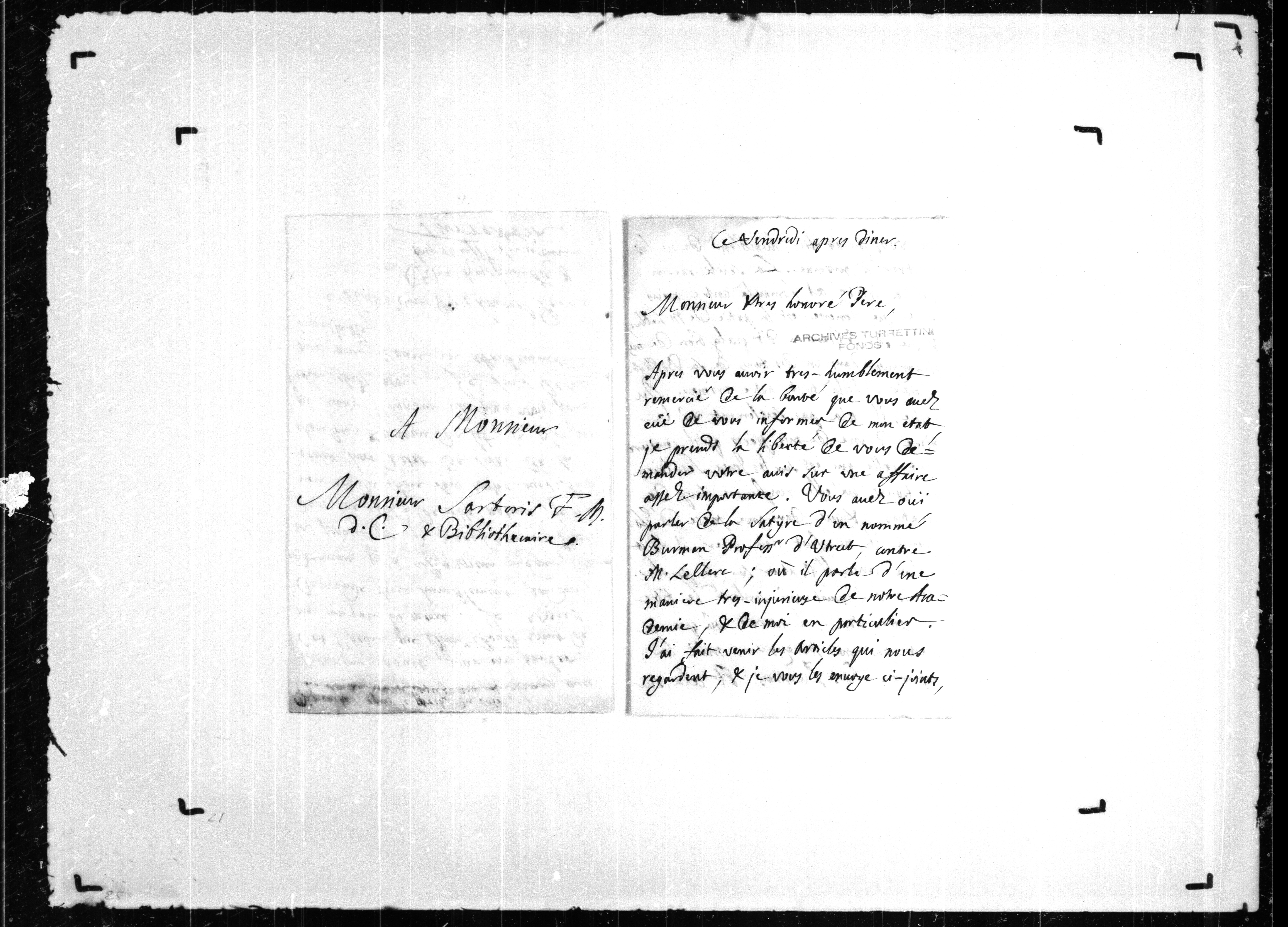 JA rend compte à Sartoris d'une affaire assez importante. [Pieter] Burman, professeur d'Utrecht, a publié une satire [Le gazetier menteur] contre [Jean] Le Clerc dans laquelle il parle de façon très injurieuse de l'Académie de Genève et de JA en particulier. Celui-ci a fait venir les articles en question et les envoie à Sartoris avec prière de ne les montrer à personne. La seule raison qui a irrité cet homme contre Genève est que cette ville est la patrie de Le Clerc et que Le Clerc a loué les harangues de JA dans sa Bibliothèque choisie. Et voilà le crime de Genève. Du reste, il adresse des critiques à l'ouvrage de JA sur les jeux séculiers en lui reprochant d'avoir rempli la harangue de citations alors qu'un orateur ne doit jamais alléguer d'autres auteurs. Or, il ne s'est même pas aperçu que cet ouvrage n'était pas une harangue mais une réponse à des questions relatives à des points d'antiquité, ce qui exigeait, bien évidemment, des citations. Tout le reste n'est qu'injures et choses censées rendre JA odieux à propos de l'abolition [de la signature obligatoire du Consensus]. Le comble est que celui [Jean Masson] qui a fourni à Burman les mémoires pour ses attaques a été à Genève et que JA ne l'aurait jamais soupçonné. Il faut voir quoi faire à présent; il y a trois possibilités: 1) laisser tomber la chose (c'est la solution pour laquelle JA a le plus de penchant mais on lui a écrit que l'affaire faisait un énorme bruit en Hollande et le silence ne semble pas la bonne tactique) 2) répondre à Burman soit dans la préface d'une harangue soit dans un périodique. C'est une solution qui présente des inconvénients puisque certains articles qu'il faudrait citer sont délicats et que Burman répondrait sûrement et de façon probablement plus emportée 3) engager le Magistrat de Genève à faire des plaintes à celui d'Utrecht. C'est peut-être la meilleure solution mais elle présente la difficulté qu'il faudrait rendre publiques les attaques de Burman, ce qui pourrait réactiver certaines réactions. Une solution consisterait à montrer au Magistrat seulement le premier feuillet contenant les injures contre l'Académie et ajouter que l'auteur décrie par la suite JA. L'expéditeur demande à Sartoris de réfléchir sur l'affaire et de transmettre les feuilles à [Antoine I] Léger, en le priant d'observer lui aussi le plus strict silence. Après cela, les trois hommes pourraient se voir dimanche après le prêche du soir avec [Jean-Robert] Chouet; c'est ce dernier qui a indiqué cette heure.