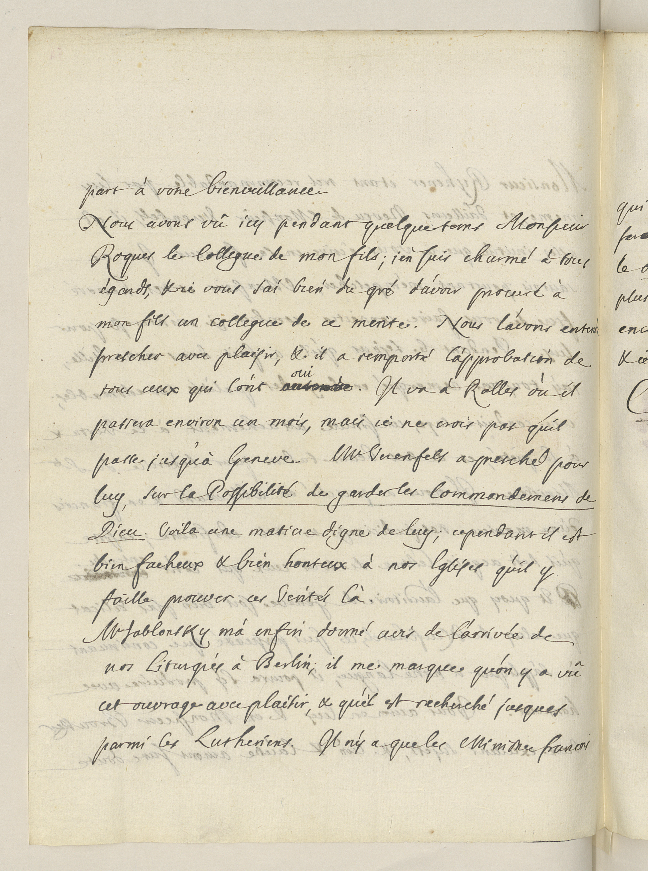 Ryhiner, neveu de [Samuel] Werenfels, est un homme qu'il n'est pas nécessaire de recommander puisque sa sagesse et son attachement à la vérité se recommandent d'elles-mêmes. Il a prêché en allemand et en français et a donné entière satisfaction à son auditoire; même si celui de Genève est plus délicat, il pourra apprécier cet homme qui fera sûrement des progrès en français. Avec [Johann Heinrich] Brucker, on aura à Genève d'excellents sujets. Roques, le collègue du fils d'Ostervald [Jean-Rodolphe II], a prêché à Neuchâtel, en charmant tous ceux qui l'ont entendu; il ira un mois à Rolle mais sans passer probablement par Genève. Werenfels a prêché à sa place à Bâle sur la possibilité de garder les commandements de Dieu: c'est une matière digne de lui mais il est honteux qu'il faille prouver une chose pareille. Les liturgies [Bâle, 1713] sont finalement arrivées à Berlin. Elles sont appréciées de tous, même des luthériens; seuls les ministres français la critiquent, cela ne surprend guère Ostervald. Il va envoyer encore dix-huit exemplaires supplémentaires qu'on leur demande.