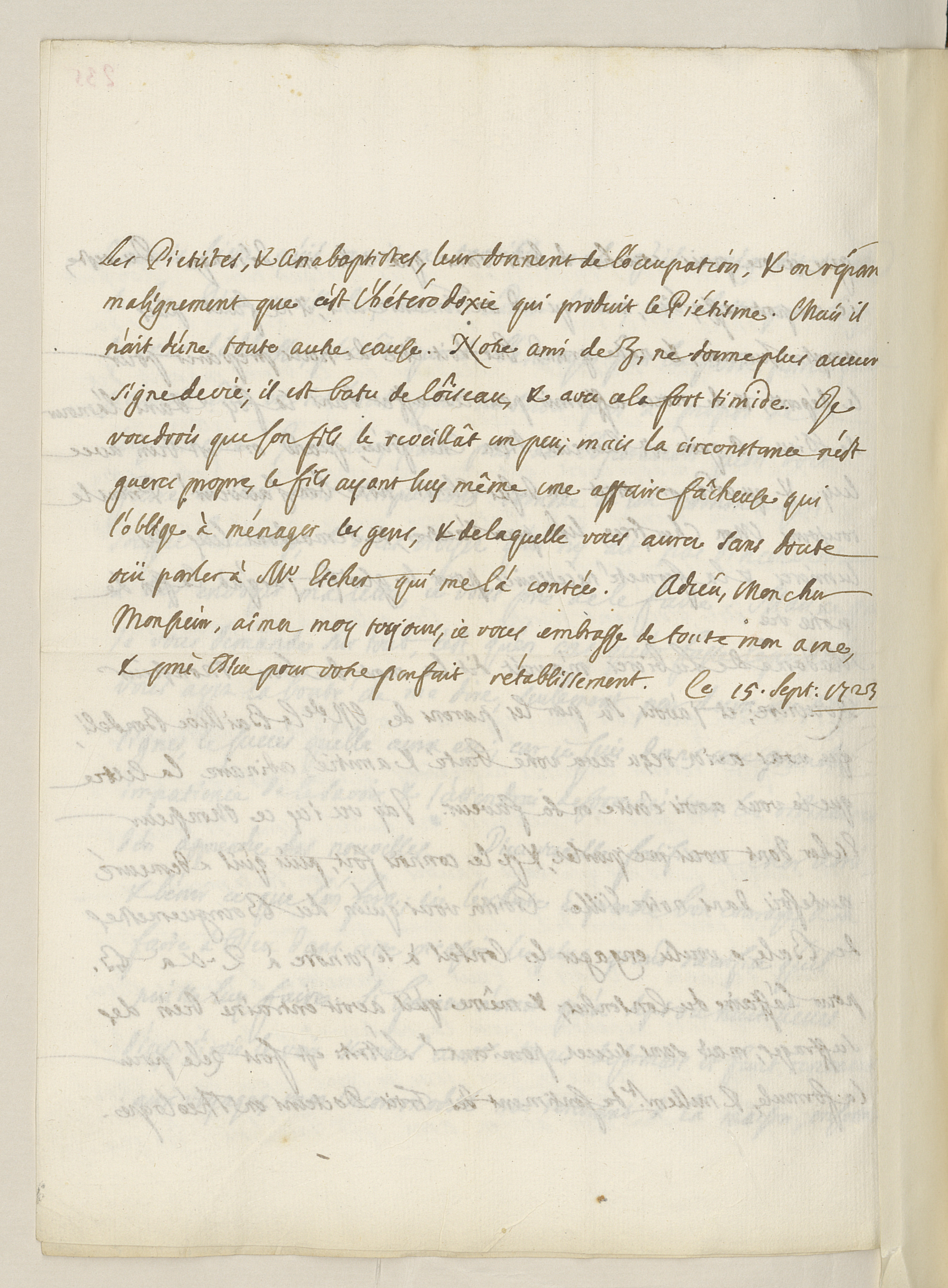 Ostervald se fait du souci pour la santé de JA et pour celle d'[Étienne] Jallabert et la dernière lettre de son correspondant l'a confirmé dans ses craintes. Il fait souvent la réflexion que des gens très utiles à l'Église sont continuellement en danger de mort alors que d'autres qui font le mal ont une santé parfaite; mais il faut repousser de telles pensées et se soumettre à la volonté de Dieu. C'est affreux que Jallabert ait le mal terrible qu'il craignait tant; Ostervald envoie à JA une lettre pour lui dans laquelle il ne fait pourtant pas allusion à l'opération qu'il doit subir, mais lui parle comme à un homme qui souffre beaucoup. Il aimerait aussi être tenu au courant des résultats de l'intervention; s'il n'avait pas l'incommodité qu'on sait, il ferait le voyage de Genève. Mais, à son âge, il faut y renoncer et se préparer au grand départ. On est tellement heureux quand on est bien avec Dieu et quand on croit en Jésus-Christ notre sauveur. Il a appris de [Marie de Langes de Montmirail] de Lubières la mort d'[Antoine] Rouvière. Il a rencontré [Hans Konrad I (?)] Escher, dont JA lui avait parlé et qu'Ostervald lui-même avait déjà rencontré. Un des bourgmestres de Bâle [Andreas Burckhardt] voulait entraîner le Conseil de Bâle à s'aligner sur Z[urich] et sur B[erne] pour ce qui est du Consensus; il avait déjà récolté plusieurs suffrages mais, heureusement, sans succès. L'antistès [Hyeronimus Burckhardt] est très favorable à la Formula et ne partage guère les sentiments des trois docteurs en théologie [Johann Christoph Iselin, Johann Ludwig Frey et Samuel Werenfels]. Il est bien occupé avec les piétistes et les anabaptistes; on veut que ce soit l'hétérodoxie qui ait produit le piétisme mais on sait bien qu'il naît d'autre chose. L'ami de Zurich [Johann Baptista Ott] ne donne plus signe de vie; il est battu de l'oiseau et, en plus, très timide. Il faudrait que son fils [Hans Heinrich II] le réveillât un peu mais il est lui-même dans une situation délicate, étant aux prises avec une affaire fâcheuse qui l'oblige à ménager les gens.