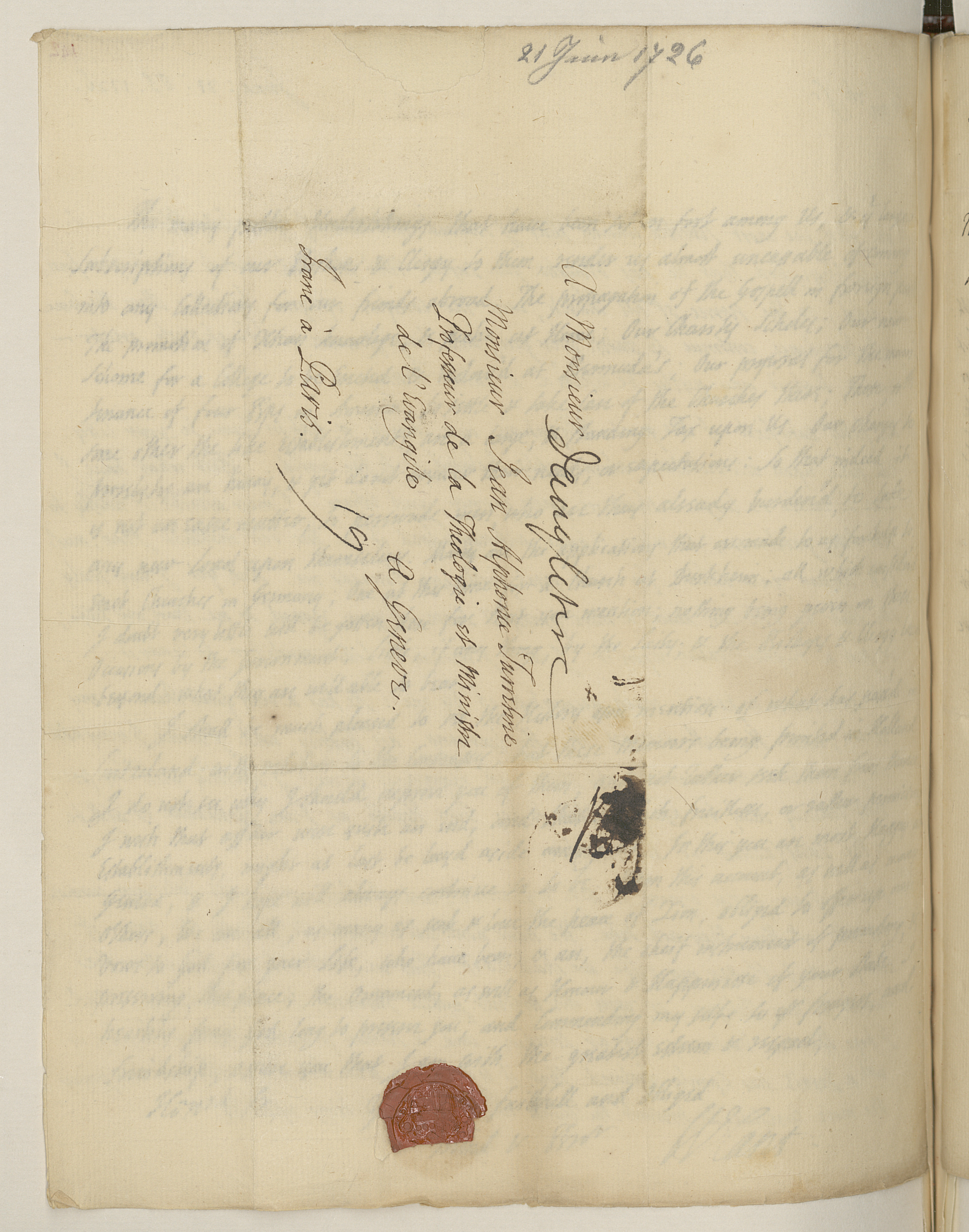 Wake est désolé d'apprendre l'état de santé de JA et prie Dieu pour qu'il se rétablisse. Il est aussi très sensible aux marques de bienveillance de Genève à l'égard de l'Angleterre et de son Église; il ne les mérite personnellement pas et est convaincu que les bonnes dispositions de JA y sont pour beaucoup. Il nourrit la plus grande estime pour [Hans Heinrich II] Ott envers qui il éprouve un grand attachement. L'état des affaires en Angleterre est encore mystérieux; on a en tout cas fait tout ce qu'on a pu pour préserver la paix en Europe et Wake espère qu'on continuera de le faire. Mais on ne peut sacrifier à cela la sauvegarde de la religion ni les intérêts nationaux: la barbarie arrivée à Dresde ainsi qu'un sermon jésuite prononcé à Leipzig prônant la destruction définitive des protestants devraient inciter les princes à empêcher la ruine dans laquelle on veut les précipiter. Les déjà très nombreuses souscriptions internes rendent pour le moment inenvisageables des collectes pour les frères de l'étranger: les charges sont lourdes, qui vont de la propagation de l'Évangile dans les terres lointaines à la promotion de la connaissance chrétienne à l'intérieur, aux écoles de charité, au nouveau collège des Bermudes, au maintien de quatre évêques en Amérique etc. Il n'est pas facile de persuader des hommes qui donnent déjà beaucoup de se soumettre à de nouvelles contributions. Wake pense donc qu'on ne pourra rien faire pour ce que mentionne JA [sc. une collecte en faveur de l'Église française réformée de Stuttgart], d'autant que le gouvernement ne donne rien pour ces choses-là et les laïcs très peu; tout retombe donc sur les évêques et les ministres. Il sera très heureux de voir le récit de ce qui s'est passé en Suisse au sujet du Consensus [Barnaud, Mémoires] mais, l'impression de l'ouvrage s'étant faite en Hollande, il pourra se la procurer facilement en Angleterre. Il espère que les choses se sont finalement calmées à ce sujet et que cela continuera.
