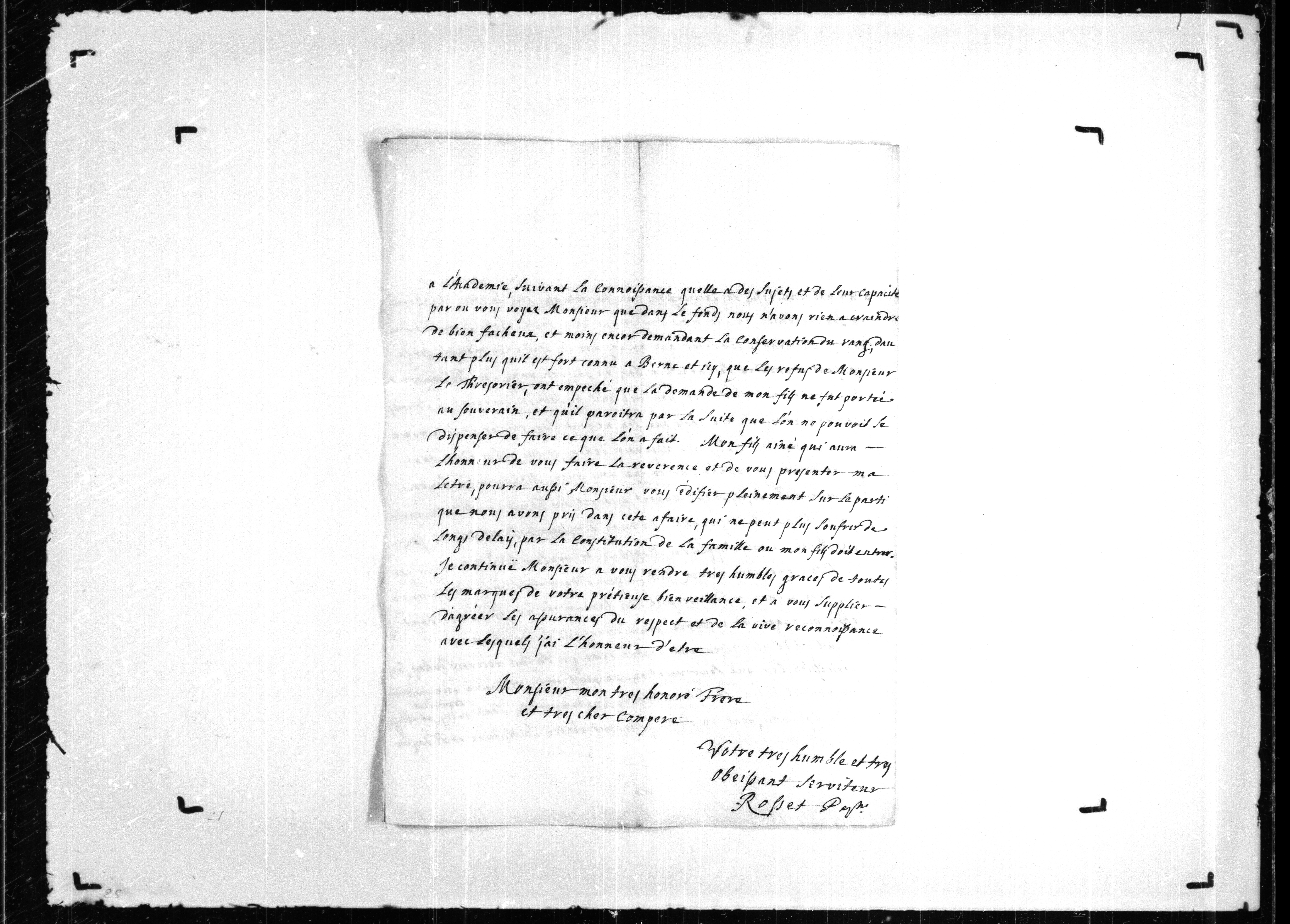 Rosset a été un peu déçu en apprenant par la dernière lettre de JA que l'âge de son fils constituait un obstacle à sa réception à Genève; il connaissait naturellement le règlement mais il pensait qu'il ne s'appliquait qu'aux personnes voulant exercer le ministère à Genève même. Il est donc dans la nécessité de revenir à sa première idée, à savoir la réception à Bâle. Son fils aîné [Rosset de Rochefort III] a écrit au pasteur Roques à Bâle qui a dit qu'il ne voyait pas d'inconvénients à ce que le...